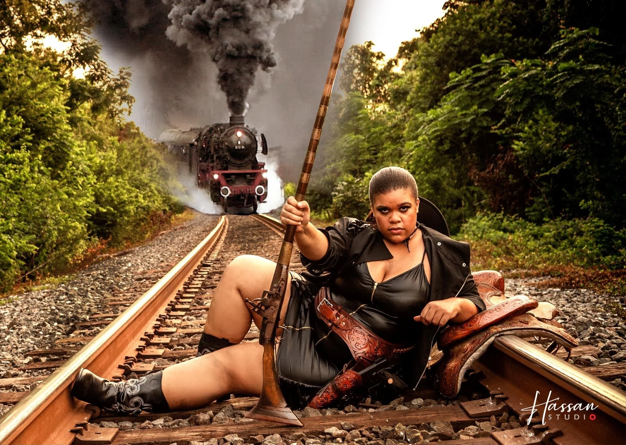 After makeup, I had my outfit ready to go! I know the women I want to portray, and the imaginary mission I’m on to rob a train. The shoot is during a hot summer evening in Texas lol It was 6:00PM yet somehow still felt like a broiler was beaming in the sky. We started off at this cool scrap yard, which in a proper story line would be the gang’s hideout. Hassan pulled out some quality props like a saddle, holsters, and a shovel. Once our imaginary meet-up was over, we galloped over to the railroad location . Creole Model is not a cat, therefore, she does not have 9 lives. I prefer to shoot on railways that no longer operate, but I trusted the photographer enough to keep a safe distance from oncoming trains. Okay… I’m lying I trust no one when it comes to trains lol, and I was ready to tuck & roll at any moment. Here is where he brought out this rustic lantern, and a violin case. Moving along, we ended the shoot at a historical train location. Now the big gun comes out, and it stood just as tall as me! All these props, combined with what I already had, helped bring another dimension to the shoot. As a result of everyone giving their best, these are the photos from the Black Bandit shoot. Some photos can only be seen exclusively on this blog. Let me know what you think in the comments, and what other types of shoots you’d like to see me try :)